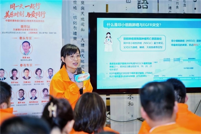活动现场,南京大学医学院金陵医院袁冬梅教授以“EGFR阳性非小细胞肺癌的防治”为题,进行了深入科普。她指出,精准治疗的关键在于基因检测以锁定靶点。治疗需分期而定:早期患者可通过手术联合辅助靶向治疗来降低复发风险;晚期患者则首选三代靶向药,不仅能高效控制病情(包括脑转移),且副作用小、便于居家管理。