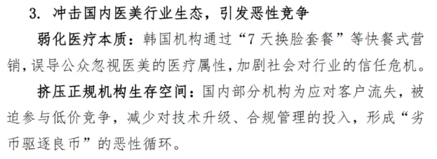 文件指出,近年来,韩国部分医美机构通过中国互联网平台,以「超低价格」「限时折扣」「免费体验」等营销手段吸引中国求美者赴韩接受医疗美容服务。此类低价引流行为严重扰乱行业正常秩序,冲击国内医美行业生态,引发恶性竞争。