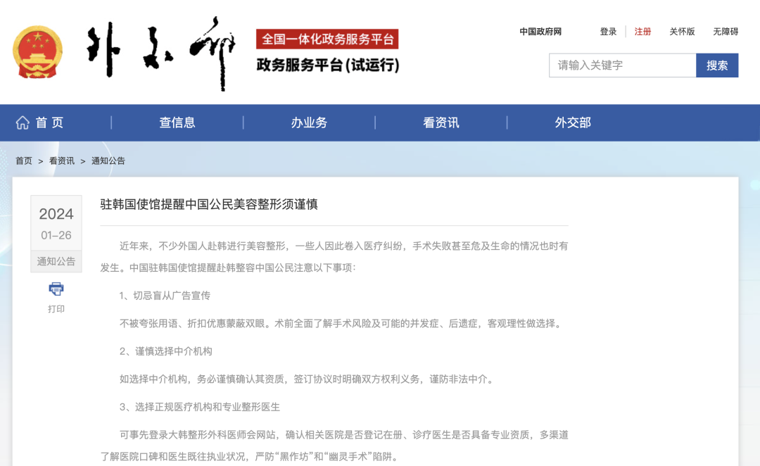 中国驻韩国使馆也多次发文提醒中国公民,赴韩美容整形须谨慎,选择正规医疗机构和专业整形医生。