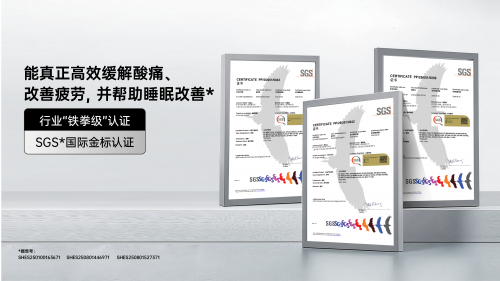 区别于传统的安全认证体系,SGS金标认证开创性地将按摩椅的“健康实效”作为核心评估标准。该认证针对现代人最为关注的三大健康诉求——改善睡眠质量、缓解肌肉酸痛和消除身体疲劳,建立了完整的评估体系。