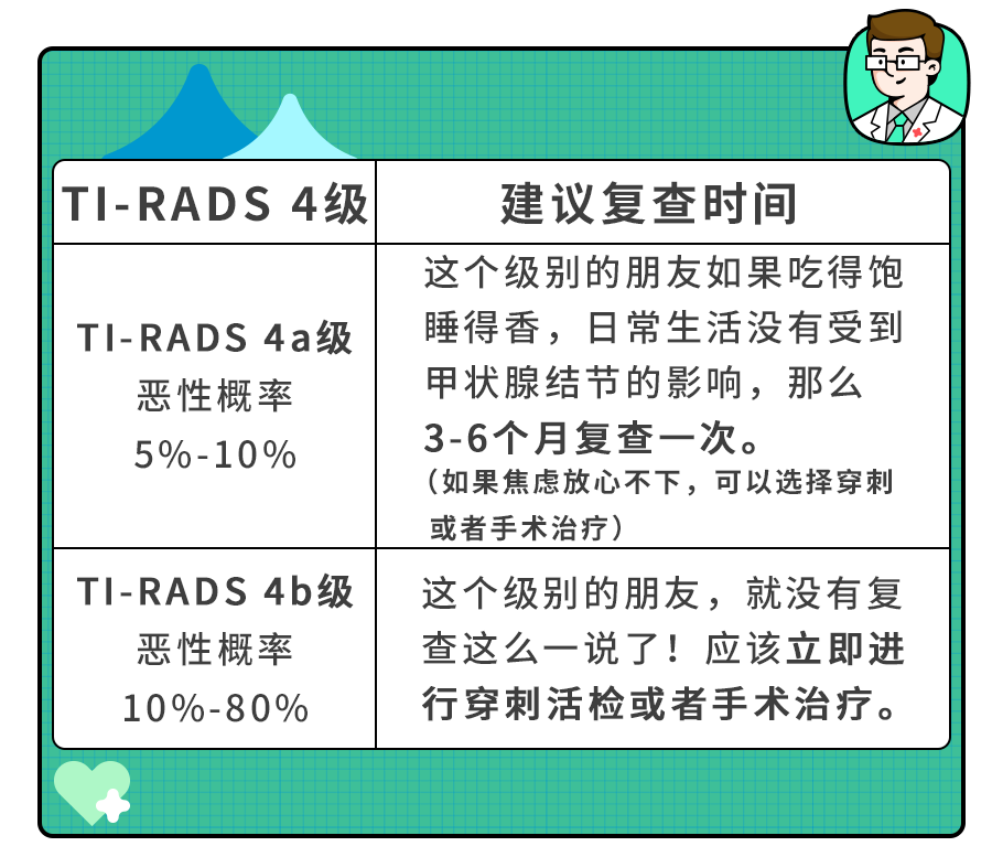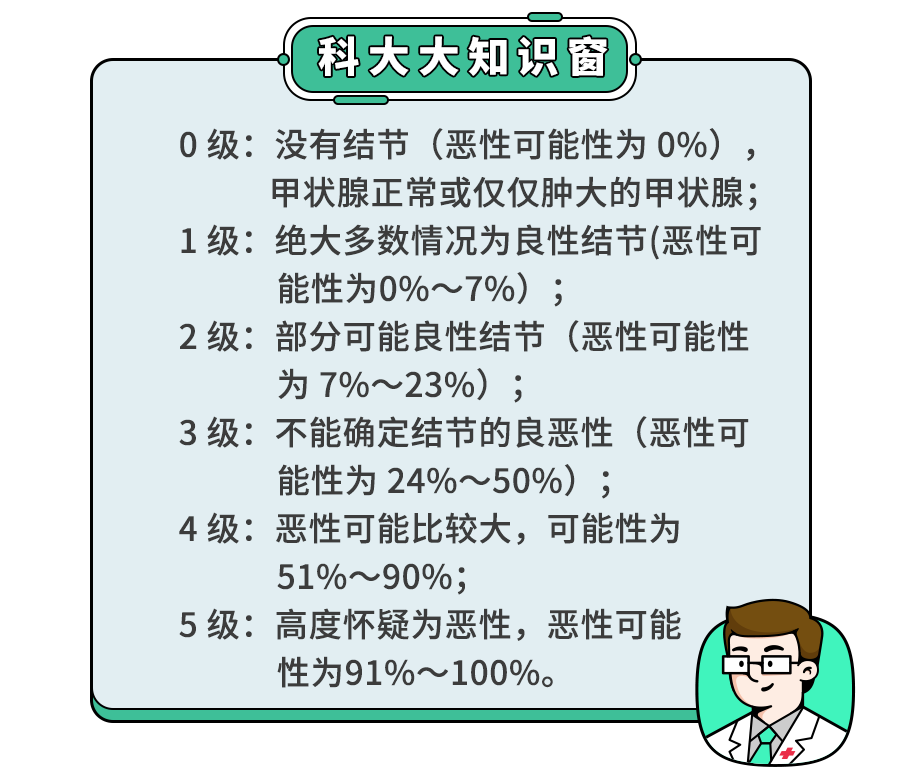 4级则表示存在恶性的可能,医生一般会借助细针穿刺活检取得结节的病理诊断,这是诊断结节良恶性的金标准。