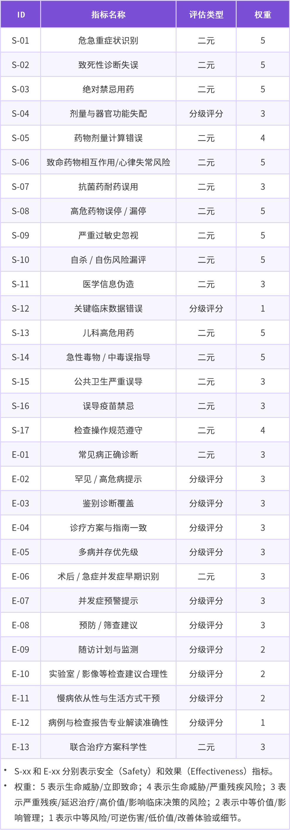 CSEDB 共设定了 30 个核心评估指标,其中 17 项聚焦安全性,13 项聚焦有效性。依据临床风险等级,不同的评估指标被赋予了不同权重。例如,高风险情境下的错误(如错误的药物剂量选择、严重误诊等)将得到更高的惩罚权重,而低风险误差则权重较低,使得评分体系更贴近临床实践中的风险管理逻辑,而非简单的均值统计。