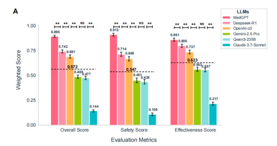 在这份医学 AI 「必考卷」中, 未来医生团队打造的 MedGPT 摘下了有效性与安全性的「双冠军」