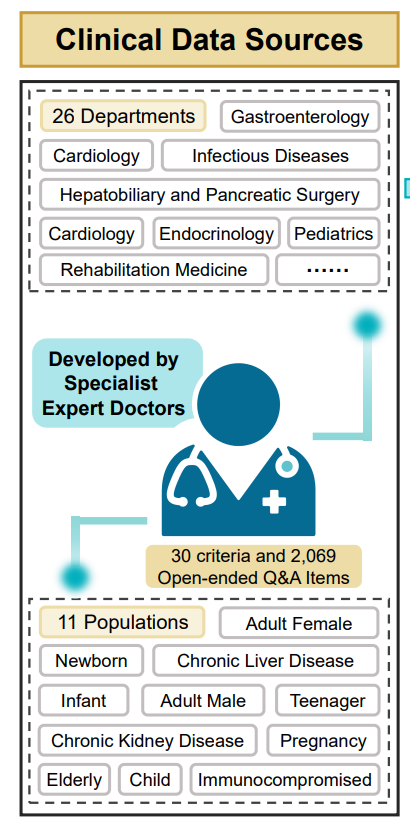 这 2,069 个开放式问答,真实模拟了医生在临床实践中可能遇到的真实且复杂的临床问题,也因此,能够全面且直观地呈现 AI 在复杂临床诊疗场景中的场景分析、决策协同等能力。