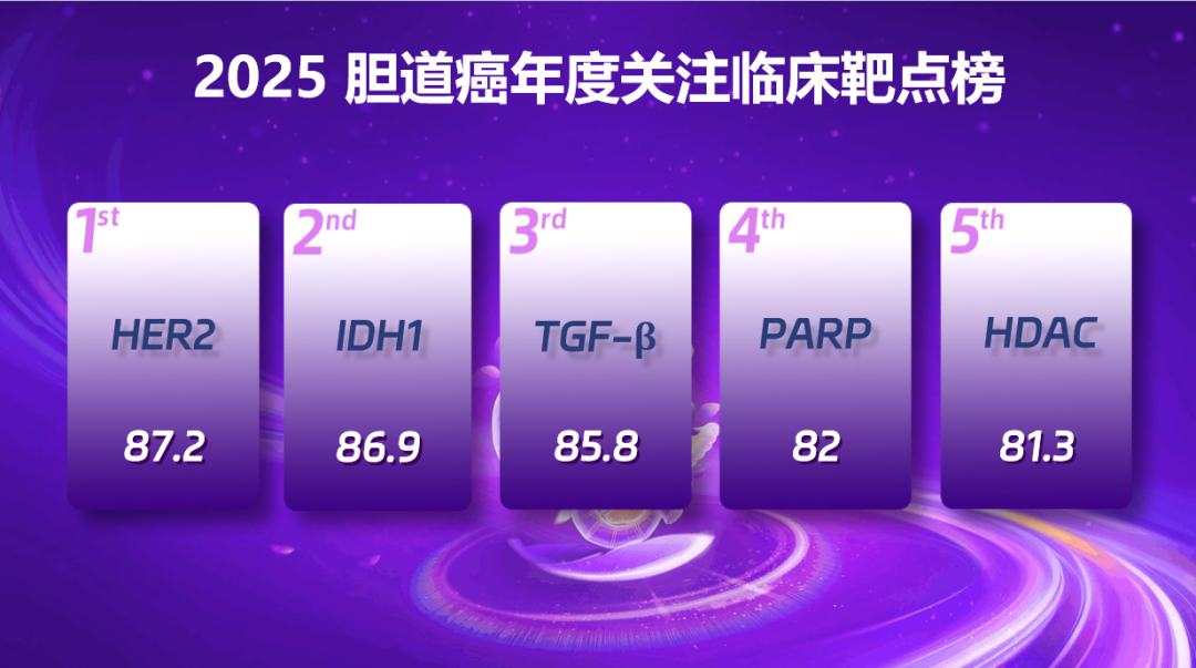 HER2 过表达或基因扩增在肝外胆管癌(5%-19%)、胆囊癌(15%-32%)更常见,肝内胆管癌仅 0%-5%。2025 年,HER2 靶向治疗在胆道癌领域取得了显著进展。在双抗治疗方面,泽尼达妥单抗治疗 HER2 阳性经治患者的客观缓解率 41.3%,中位总生存期 15.5 个月;在 ADC 治疗方面,德曲妥珠单抗治疗 HER2 阳性经治患者的中位 PFS 7.4 个月、OS 12.4 个月。HER2 靶向治疗已成为胆道肿瘤精准治疗版图中不可或缺的一环。