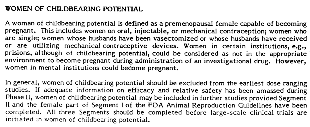 在 20 世纪相当长的一段时间里,女性,尤其是育龄期女性,曾被普遍排除在药物临床试验之外。1977 年,美国 FDA 曾发文,对药物临床研究中纳入「具有生育能力」的女性作出许多限制,这些限制几乎将育龄期女性完全排除在了临床试验之外。