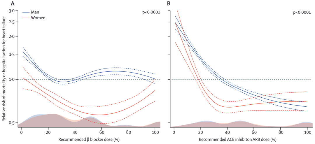 举例来说,一项 2019 年发表在柳叶刀的研究表明,在使用 ACEI/ARB 类药物和 β 受体阻滞剂治疗心衰时,男性患者获得最佳疗效的剂量就是标准治疗方案下的目标剂量,而女性患者使用标准目标剂量的 50% 即达到最佳疗效,再继续增加剂量,疗效也不会增加。
