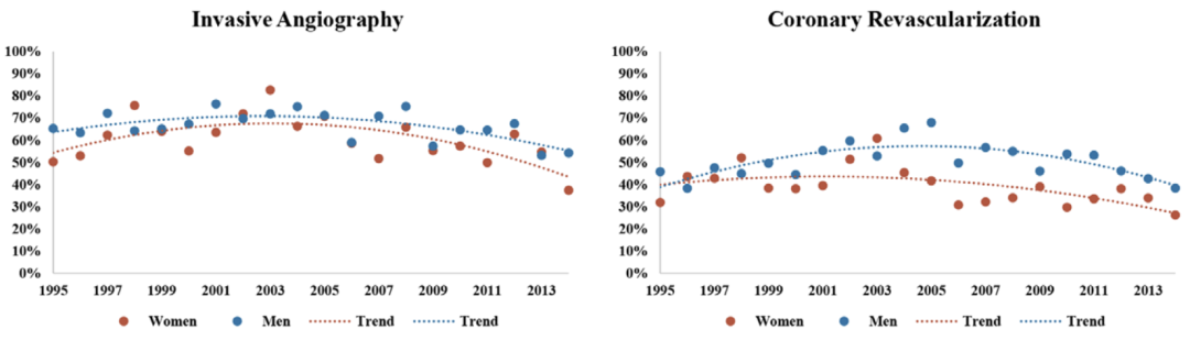 年轻女性和男性急性心梗患者接受血管造影和冠脉再灌注治疗的比例