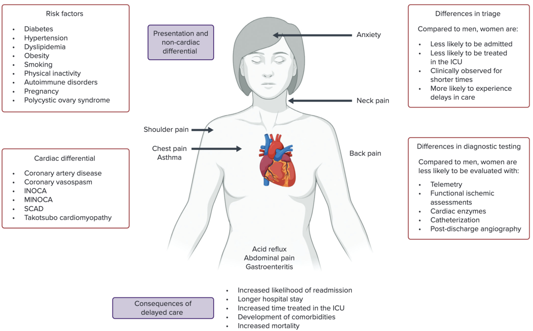 有研究表明,女性急性心梗患者中,会在症状出现后 >6 小时才就诊的比例明显高于男性(45% vs. 36%,P=0.008)。