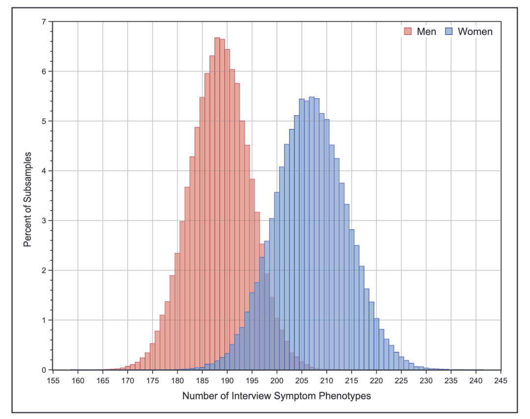 以急性心梗为例,相比于男性患者,女性患者的独特症状表型有更多的变异,并且单个患者同时伴有的症状数量也更多。