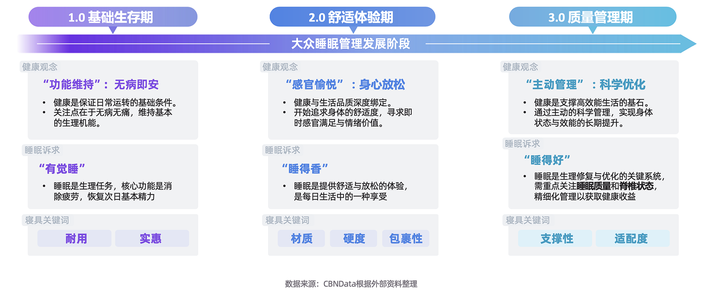 随着健康观念从“被动医疗”转向“主动健康管理”,睡眠管理已经从最基础追求“功能维持”的1.0阶段、主观追求“感官愉悦”的2.0阶段,步入当前追求主动“科学优化”的3.0阶段。