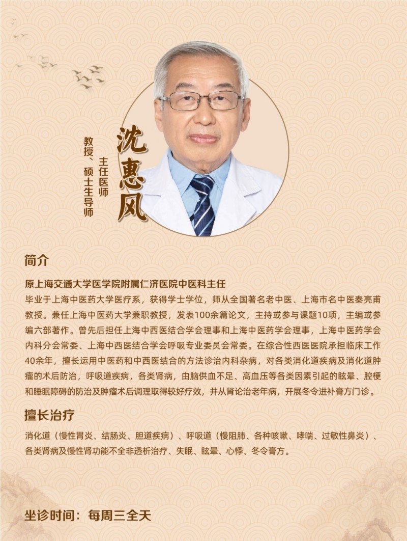 沈惠风教授的从医之路,始于上海中医药大学医疗系,师从全国知名老中医、上海市名中医秦亮甫教授,系统传承名老中医的诊疗精髓,深耕中西医融合的诊疗之道,逐步形成了自己独树一帜的诊疗风格。曾任上海交通大学医学院附属仁济医院中医科主任,长期致力于内科疾病临床诊治,尤其是肾病、呼吸道疾病、消化道疾病等的诊疗,吸引了患者慕名追随其就诊。