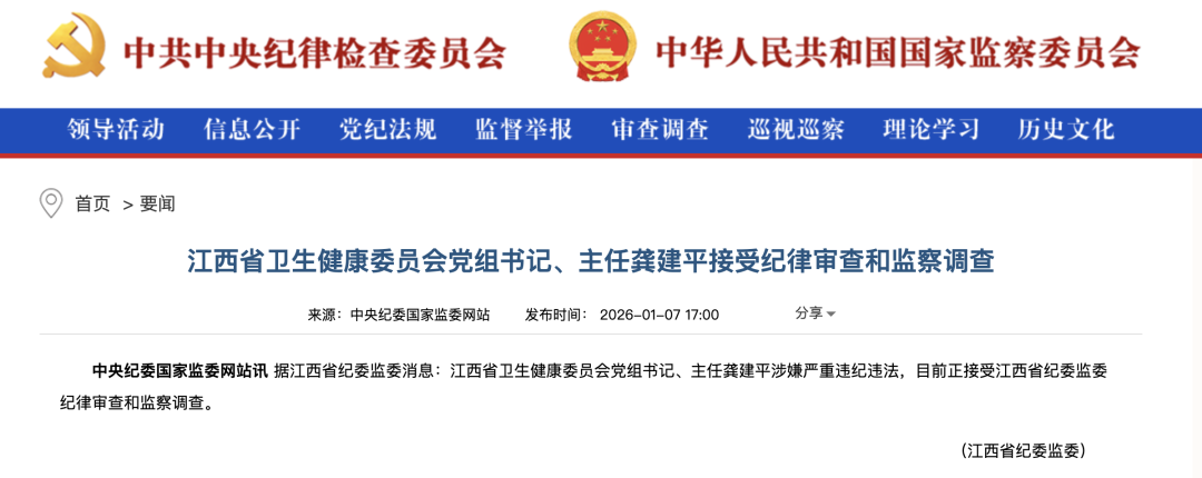 据中央纪委国家监委网站,江西省纪委监委消息:江西省卫生健康委员会党组书记、主任龚建平涉嫌严重违纪违法,目前正接受江西省纪委监委纪律审查和监察调查。
