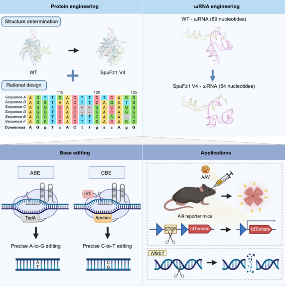该项工作以真核来源、体积极小的“迷你剪刀Fanzor”为核心,通过蛋白与ωRNA协同工程化改造,在哺乳动物细胞中编辑效率成倍提升;首创在不产生双链断裂情况下以Fanzor系统搭建A→G/C→T双向碱基编辑平台,在眼部单AAV一针递送即可获得清晰在体编辑信号。