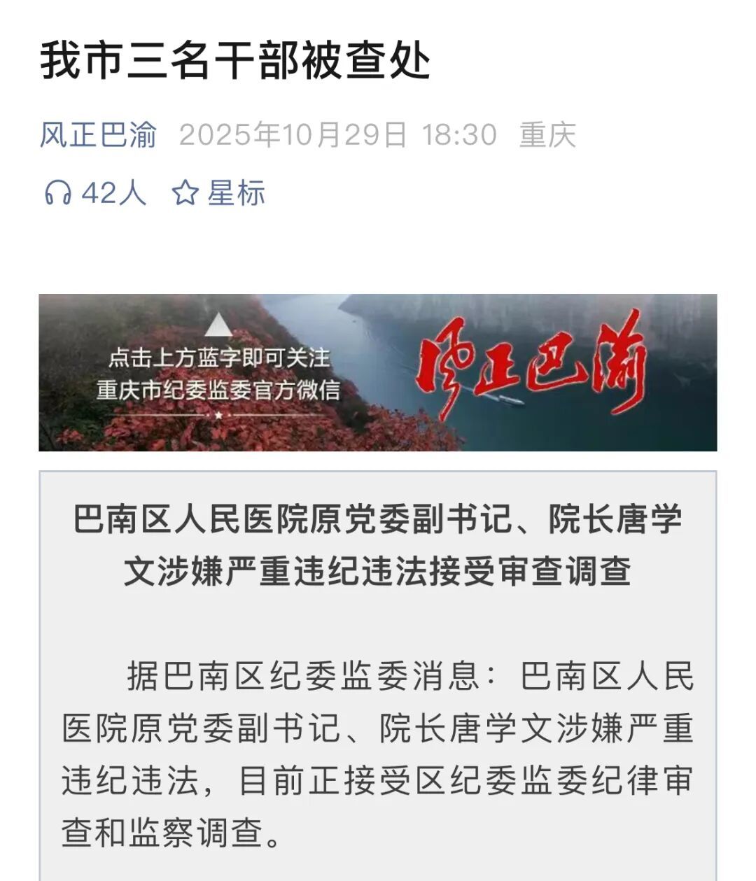 据重庆巴南区纪委监委 10 月 29 日消息,巴南区人民医院(三甲医院)原党委副书记、院长唐学文涉嫌严重违纪违法,目前正接受区纪委监委纪律审查和监察调查。