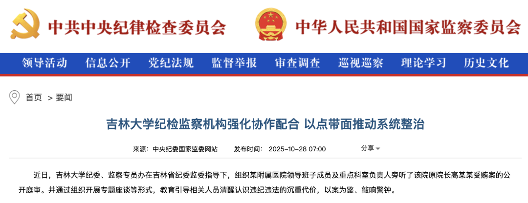 10 月 28 日,中纪委官方发文介绍,吉林大学组织某附属医院领导班子成员及重点科室负责人旁听了该院原院长高某某受贿案的公开庭审。
