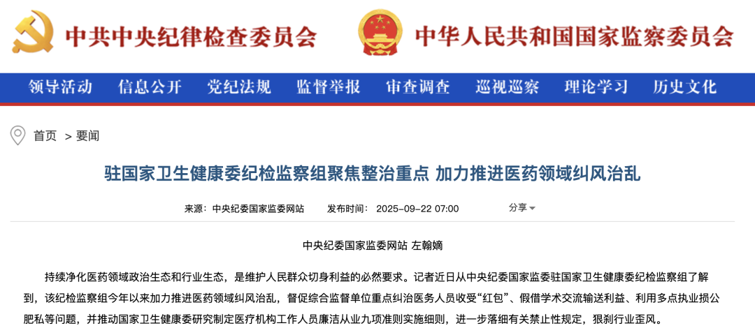 9 月 22 日,中纪委发文谈及「加力推进医药领域纠风治乱」。其中提到,中央纪委国家监委驻国家卫生健康委纪检监察组今年以来监督单位重点纠治医务人员收受「红包」、假借学术交流输送利益、利用多点执业损公肥私等问题。