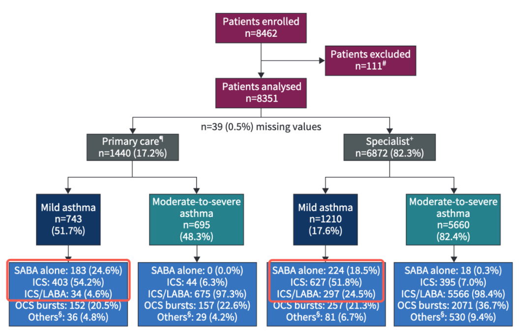 对于轻度哮喘,基层医院开 SABA 单药缓解更多,用 ICS-LABA 更少[2]