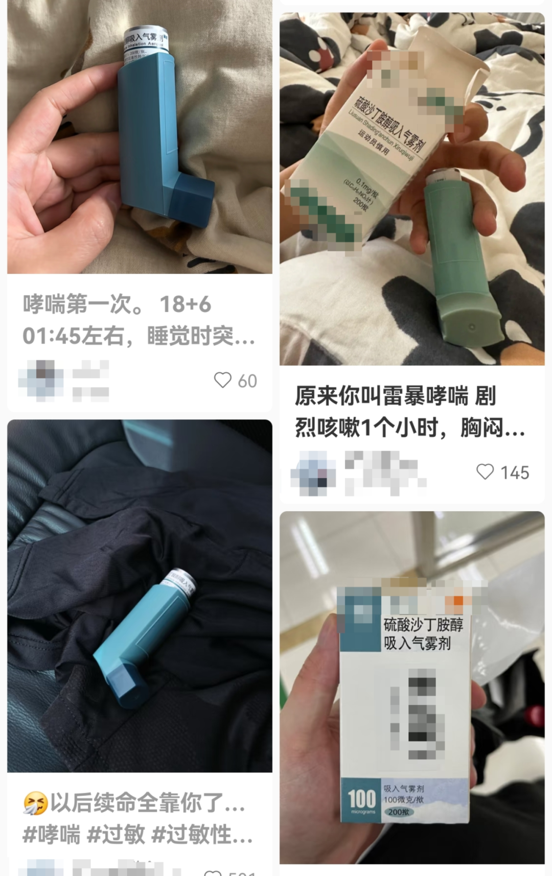在社交平台搜索「哮喘」,可以看到不少患者拿着一种蓝绿色的吸入气雾剂,分享自己用它「续命」的故事。