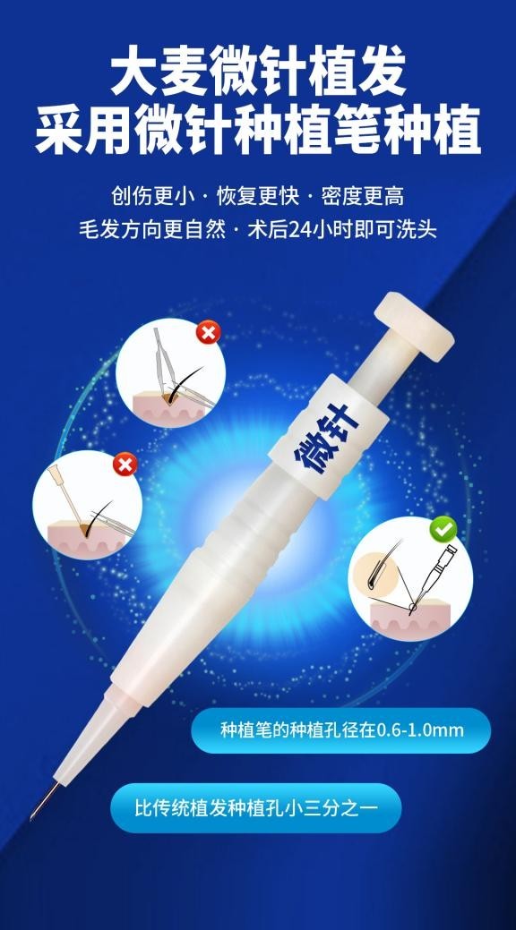 不同于传统植发使用宝石刀和镊子的方式,大麦微针植发采用专有的0.6毫米至1.0毫米种植笔,种植孔面积比传统植发小约三分之一,创伤更小、恢复更快,24小时后即可正常洗头,尤其适合注重效率与隐私的商务精英人群。