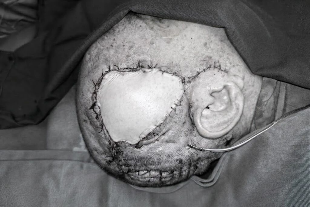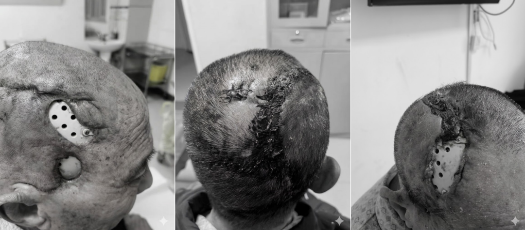 此后,我们又辗转到其他医院接受治疗。2025 年 10 月 8 日,行颅内清创+皮瓣转移术,但感染未能控制;短短 20 天后,10 月 28 日,再行二次皮瓣转移修复,术后仅一周伤口再度破溃。