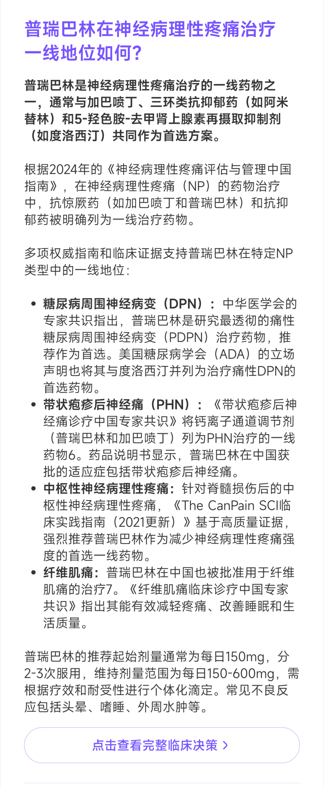 「这是神经内科和疼痛科的常用药。尤其对于带状疱疹后神经痛,普瑞巴林几乎是首个有效解除疼痛的药物。」河南医药大学第一附属医院神经内科主任医师袁彬提到,普瑞巴林也是众多指南首推的神经痛治疗药物。
