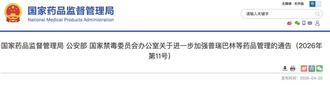 今日,国家药品监督管理局、公安部、国家禁毒委员会办公室发布关于进一步加强普瑞巴林等药品管理的通告。